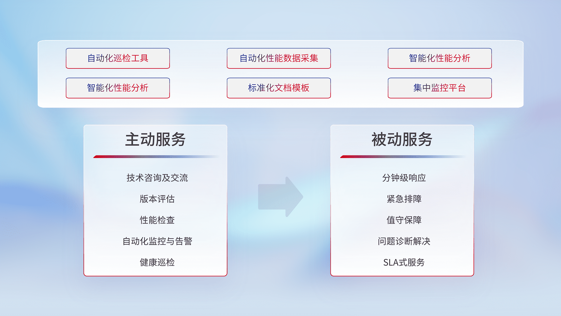智能化工具和标准化文档,,,保障服务质量,,,,提供主动服务(包含技术咨询、、、、版本评估、、性能检查、、、、自动化监控与告警、、健康巡检)和被动服务包含(分钟级响应、、、紧急排障、、值守保障、、、问题诊断解决、、SLA服务)。。